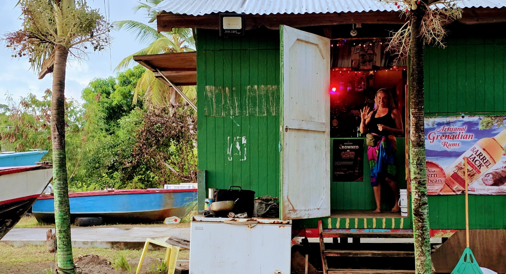 As evening approached, we dinghied to a shady hut on the beach. The scene was pure island style—a shack with a window overlooking the sand where a man stood inside smoking a joint the size of a cigar. He pulled a massive jug from “under the counter,” a local Grenadian tradition. The jug was a wild collection of roots, seeds, twigs, bark, and spices backfilled with potent white rum. One by one, Ron, Katie, Maria, and I cautiously dipped our tongues into a small paper cup to taste the fiery liquid. When it reached Kent’s hands, down the hatch it went. Though I worried he might have been poisoned, Kent said he was perfectly fine and relished the experience.