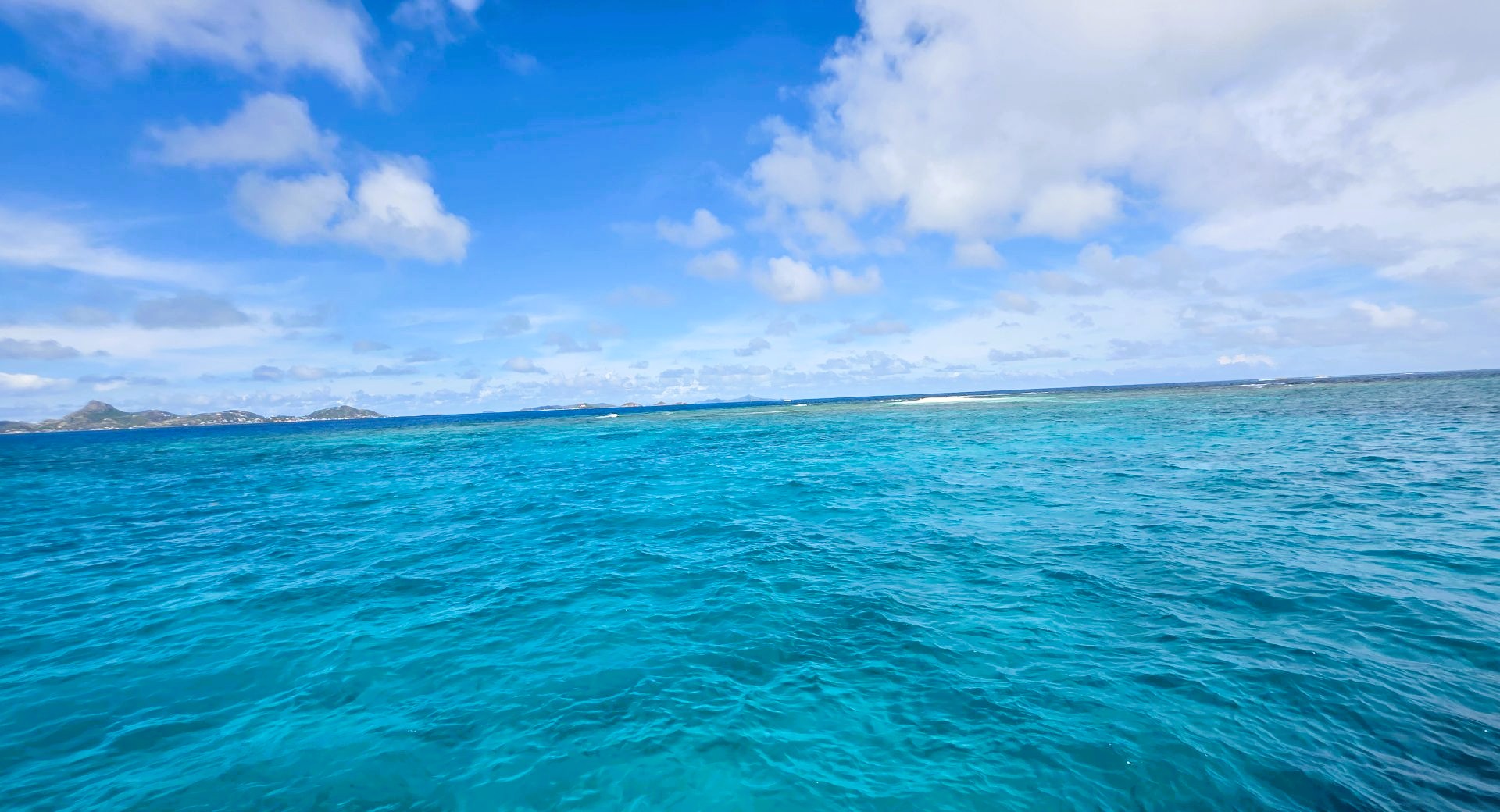 At 2:00 PM, Kent navigated us to a spot in the open ocean where we dropped anchor. Situated between Union Island and Petit St. Vincent was what appeared to be a tiny sandbar rising up in the middle of the ocean. This was Mopion Island, one of the smallest “islands” in the Caribbean. (It’s actually a cay, a small, low-elevation, sandy island on the surface of a coral reef, and its size fluctuates significantly with the tides.)