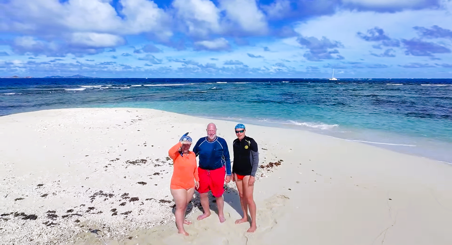 Kent, Ron, and I dinghied out to the island to explore, check the anchor, and dive on the lobster trap that was nearby. We were careful to bring the dinghy well up onto the beach and anchor it into the sand. Standing on that shifting sandbar without a single piece of man-made shelter felt truly wild, just three people on a patch of sand in the middle of the sea, surrounded by nothing but blue water and the sound of waves.
