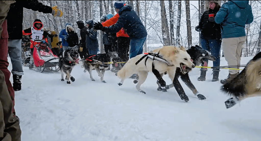 There we had front-row seats. The dogs, standing in line in their harnesses, dipped their muzzles into the fresh powder to rehydrate. The steam rose from their breath and frost clung to their whiskers like tiny diamonds. The musher gave a quick nod before a sharp whistle sent them lunging forward. Just as quickly as they had arrived, they were gone.